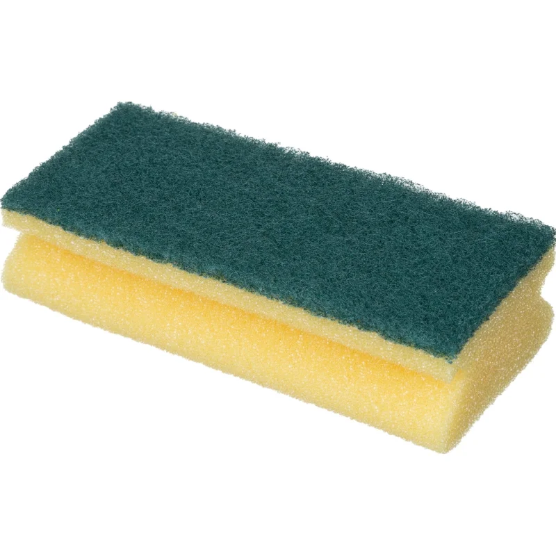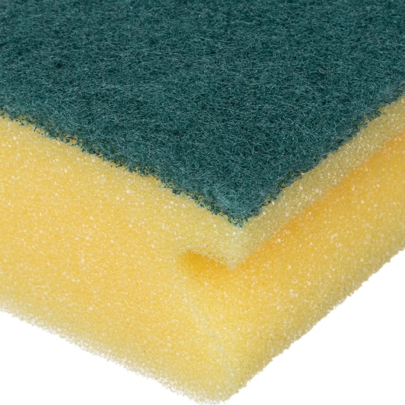 Высокоэффективная губка с зеленым абразивом идеально подходит для мытья посуды и удаления пятен.