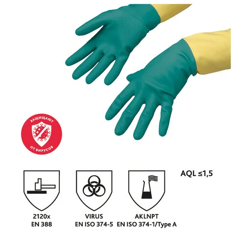 Очень высокая сопротивляемость химикатам и моющим средствам – класс Type A – AKLNPT по стандарту EN ISO 374-1. Очень высокая механическая защита к истиранию и проколам 2120Х по стандарту EN 388. Защищают от бактерий, возбудителей грибковых заболеваний и вирусов. Протестированы по стандарту EN 374-5 на герметичность. Соответствуют EAC ТР ТС 019/2011. СЕ Категория III – максимальная защита от рисков по европейским стандартам. Сверхпрочные трехслойные латексно-неопреновые перчатки подходят для интенсивной работы с использованием агрессивных моющих средств. Очень высокая устойчивость к изнашиванию и разрывам. Хлопковое напыление внутри для комфортного ношения. Низкая теплопроводность – дополнительная защита рук при работе с горячей водой. Рельефная сетчатая структура на ладонях и пальцах для надежного захвата. Аккуратный волнообразный обрез манжеты. Не имеют резкого специфичного запаха резины. Можно стирать и сушить.