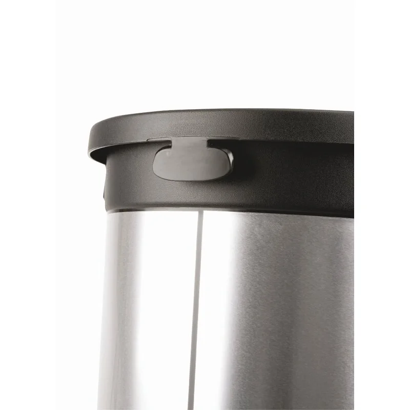 Контейнер выполнен из износостойкого пластика с покрытием под металл. Гладкая поверхность способствует легкой очистке, на ней не остаются следы от пальцев. В комплект входят резиновые ножки, предотвращающие скольжение и защищающие пол. Внутри имеется фиксатор мешка для мусора и встроенная ручка на дне для удобства опустошения. Конструкция включает воронкообразную крышку с бесконтактной технологией «чистые руки» и двустворчатую крышку, скрывающую содержимое.