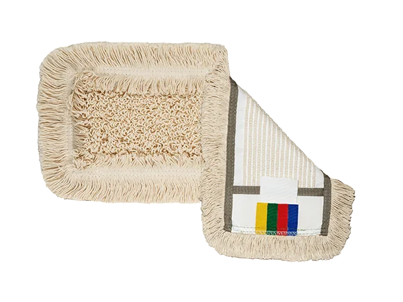Рабочая поверхность мопа выполнена из тафтинговых нитей, состоящих из 95% хлопка и 5% прочих материалов. Основа, карманы, ремни, окантовка и хлястики изготовлены из 100% полиэстера. Карманы плотно прилегают к держателю и обладают высокой устойчивостью к деформации.