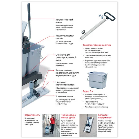 Эргономичное крепление мопов на ремнях исключает необходимость их снимать для выжимания, что увеличивает скорость уборки.
