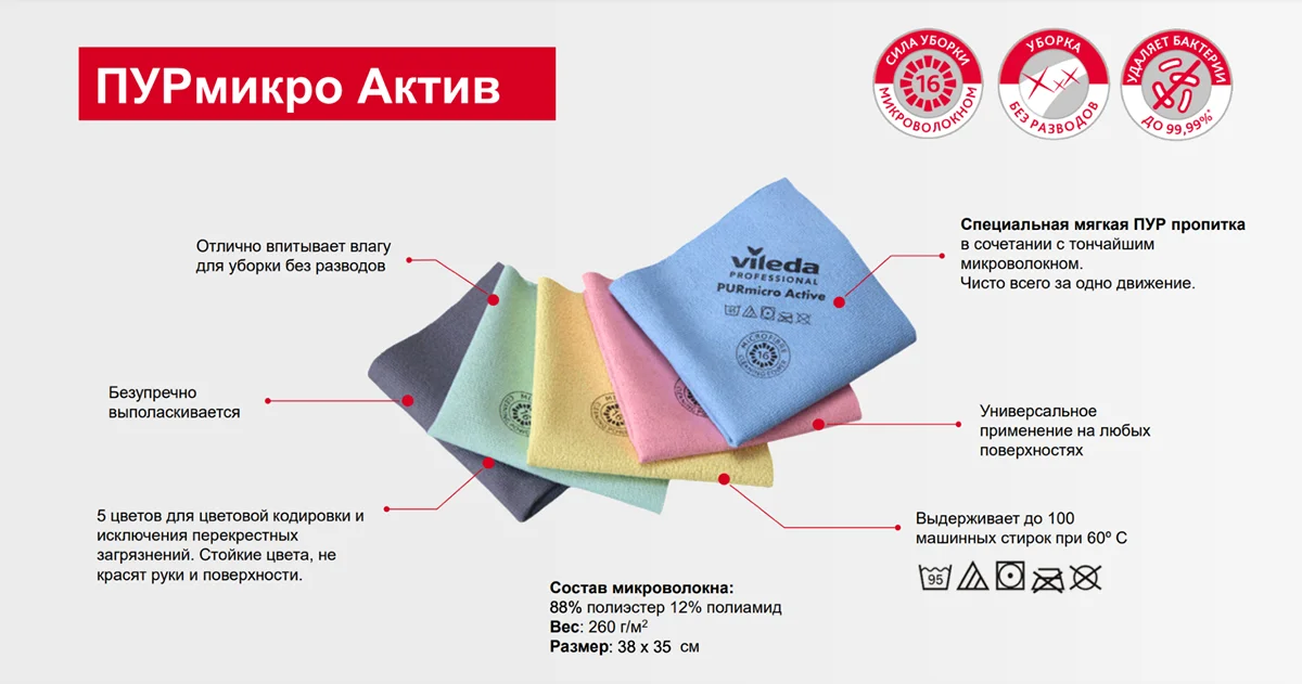 Салфетка идеально подойдет для коммерческой недвижимости, HoReCa (санатории, отели, рестораны, кафе, бары, столовые, кейтеринг), клининговых компаний, производств и многих других сфер деятельности. Ежедневная уборка любых поверхностей станет легче и эффективнее! Удаляет пыль, сор, жировые загрязнения, бактерии, вирусы, отпечатки пальцев, известковый налет и собирает влагу. Подходит для любых поверхностей и материалов, включая мебель, смесители, сантехнику, столешницы, дерево, пластик, стекло, зеркала, мониторы и многое другое. Уборка станет удобной и комфортной благодаря использованию методов Свеп Про, ‘ведро-вода’, спрей метод.Особенности и преимущества:Благодаря специальной ПУР-пропитке и микроволокну, салфетка эффективно удаляет загрязнения и влагу за одно движение, обеспечивая быстрое высыхание поверхности без необходимости дополнительного прохода.Ультратонкое микроволокно разделено на 16 сегментов для глубокого проникновения в поры поверхности и эффективной очистки.Универсальное применение.Салфетки ПУРмикро Актив удаляют до 99,99% бактерий с поверхности без использования дезинфектанта.*Повышенная впитываемость.Не оставляет ворса.Отлично выполаскивается от мелких частиц, таких как песок, крошки, земля, пыль, что исключает царапины на деликатных поверхностях.Мягкая и приятная на ощупь в сухом и влажном состоянии.5 цветов для цветовой кодировки и исключения перекрестных загрязнений.Возможность использования с кислотными моющими средствами для уборки санитарных зон в рабочей концентрации.Долгий срок службы.Подходит для работы с пищевыми предприятиями, подтверждено Экспертным заключением в РФ.Подходит для термохимической дезинфекции.Плотность: 260 г/м2Цвет: жёлтыйРазмер/Объем: 38х35 смСостав: Микроволокно (88% полиэстер, 12% полиамид), пропитка PUR (гетероцепный полимер высокомолекулярного соединения / polyurethane)Количество машинных стирок: выдерживает до 100 машинных стирок при температуре 60°C и соблюдении рекомендаций Vileda ProfessionalВес: 34,6 гТолщина: 1,78 мм